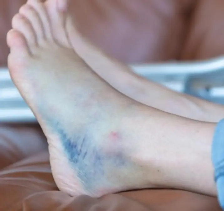 ภาพที่ปรากฏแสดงให้เห็นเท้าที่มีสีคล้ำหรือรอยฟกช้ำผิดปกติ ซึ่งอาจเกิดจากการไหลเวียนเลือดที่ลดลง หากเลือดไปเลี้ยงไม่เพียงพอ แผลเล็กน้อยอาจหายช้าหรือไม่หายเลย