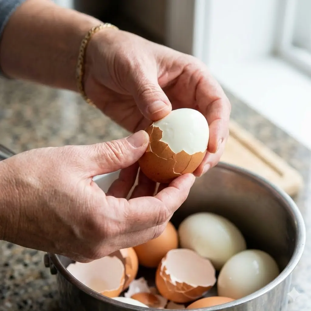 ขั้นตอนนี้สำคัญมาก เพราะการลดอุณหภูมิอย่างรวดเร็วจะทำให้เนื้อไข่หดตัวแยกออกจากเปลือก ส่งผลให้ปอกได้ง่ายขึ้นอย่างชัดเจน