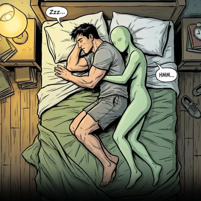 ภาพชายหนุ่มที่กำลังนอนหลับอยู่บนเตียง แต่มีเงาสีเขียวลักษณะคล้ายร่างลึกลับโอบกอดจากด้านหลัง พร้อมคำว่า “HMM…” สื่อถึงบางสิ่งที่มองไม่เห็นแต่กำลังรบกวนการพักผ่อน ข้อความบนภาพตั้งคำถามว่า การตื่นนอนช่วงตี 3 หรือตี 4 อาจเป็นสัญญาณเตือนบางอย่างของร่างกาย ซึ่งหลายคนอาจเคยประสบโดยไม่ทันสังเกต