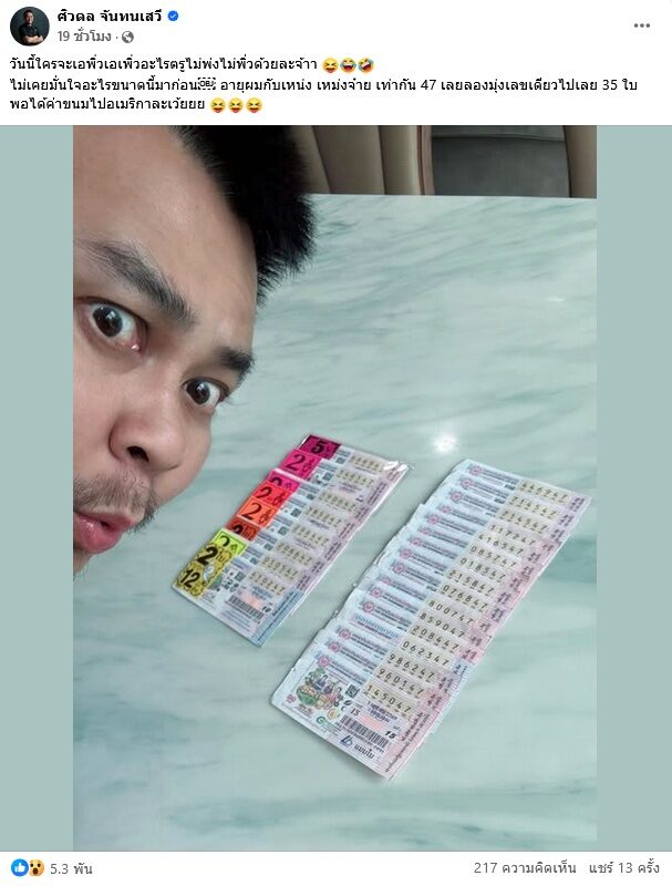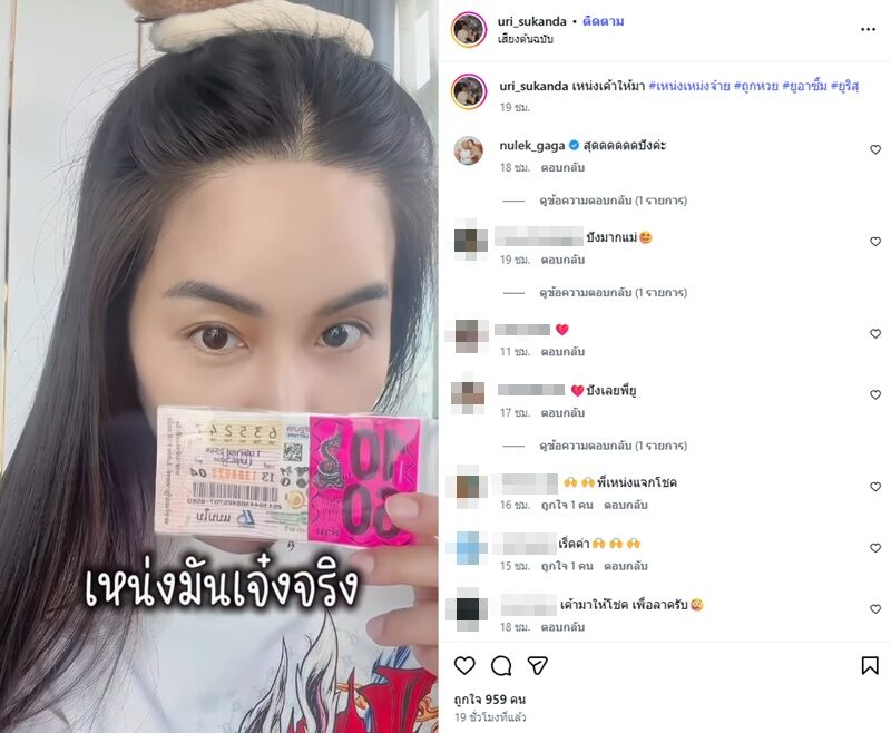 ถูกหวย 47 พร้อมแคปชั่นว่า “รอรับบุญเลยพี่ทั้งบริษัท” นุ้ย ก็เฮลั่นบอกด้วยว่า แจง ก็ถูกด้วย