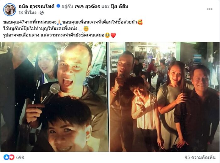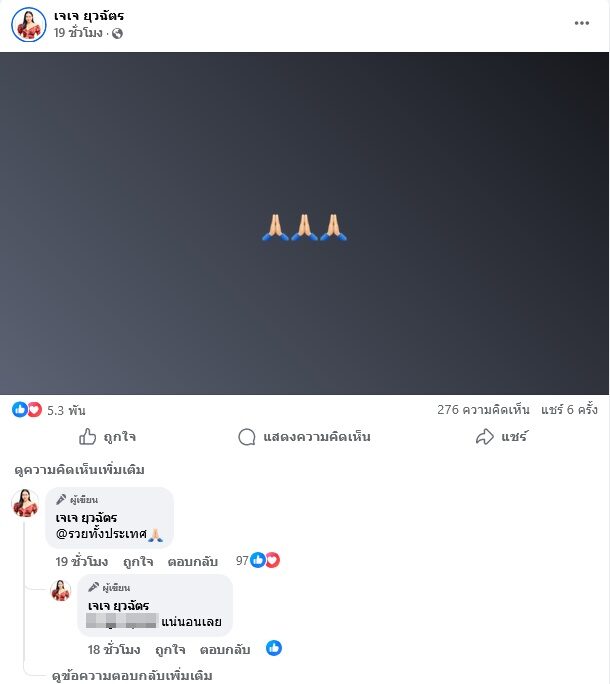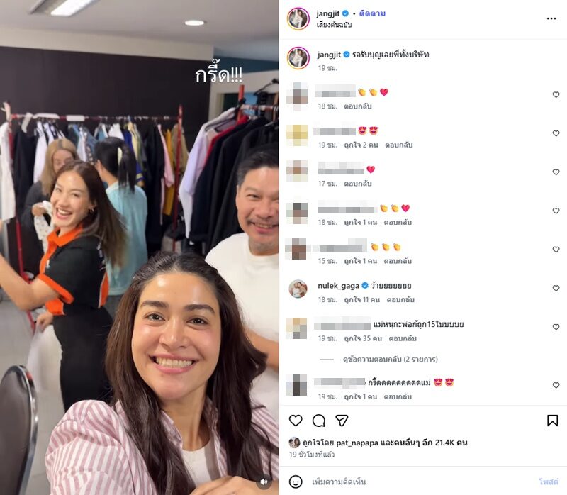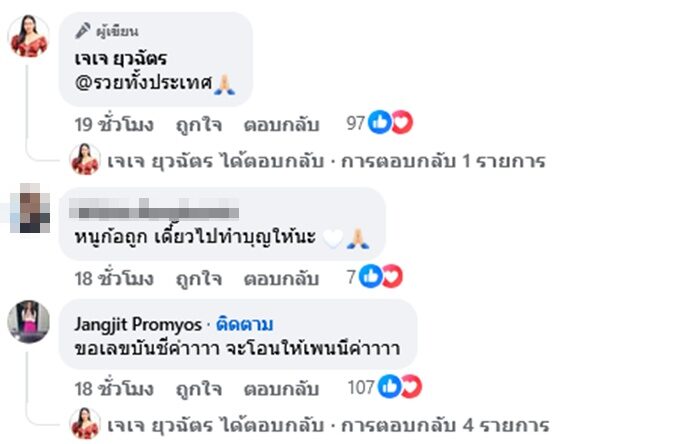 ด้าน เจเจ อดีตภรรยา เหน่ง ก็โพสต์อิโมจิไหว้ขอบคุณ และคอมเมนต์ด้วยว่า รวยทั้งประเทศ ขณะที่ แจง ปุณณาสา ภรรยา แจ๊ส ก็เข้ามาคอมเมนต์ด้วยว่า “ขอเลขบัญชีค่าาาา จะโอนให้เพนนีค่าาาา”