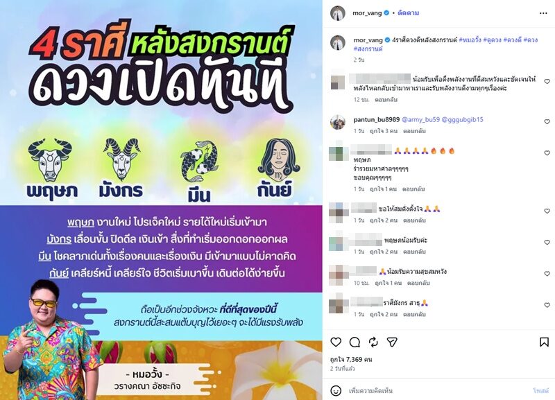ช่วงเทศกาลสงกรานต์เปลี่ยนผ่านปีใหม่ไทยดวงเปลี่ยนเผยราศีดวงเปิดทันที หมอวั้ง วรางคณา เปิด 4 ราศีดวงดีหลังสงกรานต์ ดังนี้