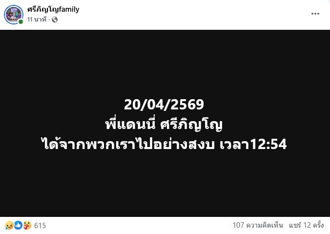 ซึ่งข้อความดังกล่าวระบุไว้สั้นๆ แต่เต็มไปด้วยความอาลัยว่า "20/04/2569 พี่แดนนี่ ศรีภิญโญ ได้จากไปแล้วเวลา 12.54 นะคะ"