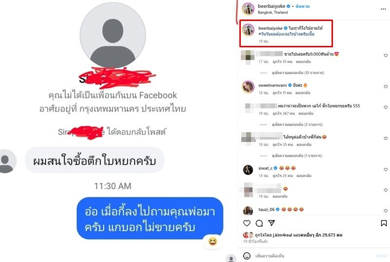 ล่าสุด เบียร์ ใบหยก แคปข้อความคนที่มาถาม “ผมสนใจซื้อตึกใบหยกครับ” ซึ่งเจ้าตัวก็ได้ตอบว่า “อ๋อเมื่อกี้ลงไปถามคุณพ่อมาครับ แกบอกไม่ขายครับ”
