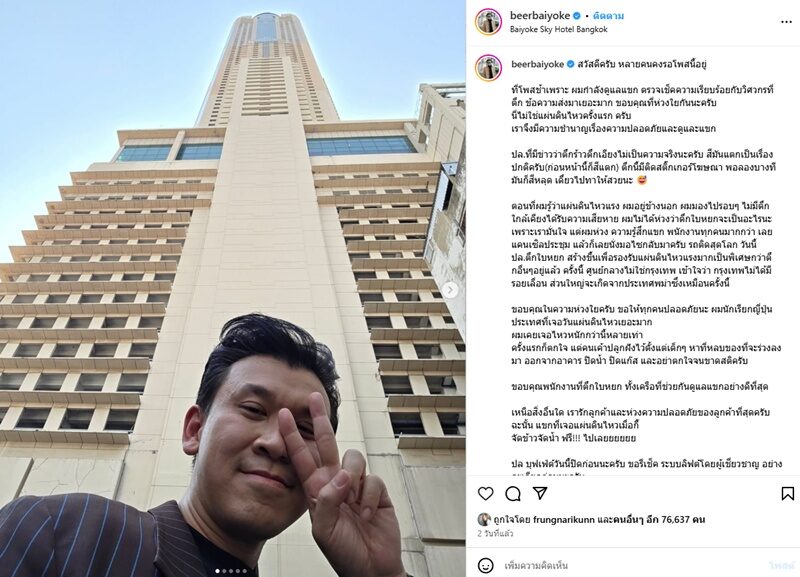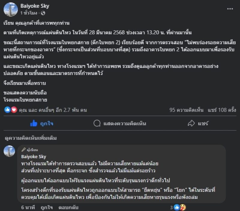 หลังจากพิสูจน์ความแข็งแกร่ง ตึกใบหยก2 หรือ โรงแรมใบหยกสกาย ไม่เกิดผลกระทบแต่อย่างใดแม้ต้องเจอกับเหตุการณ์แผ่นดินไหวแรงในพื้นที่กรุงเทพฯ โดยทั้งสองพี่น้อง เบียร์ ใบหยก และ บุ้ง ใบหยก ก็โพสต์ชี้แจงชัดๆ ทั้งยังแชร์โพสต์ของ Baiyoke Sky ที่ตรวจสอบตึกแล้ว แม้แต่ส่วนที่เปราะบางที่สุด คือ กระจก สำรวจแล้วก็ไม่มีรอยร้าว
