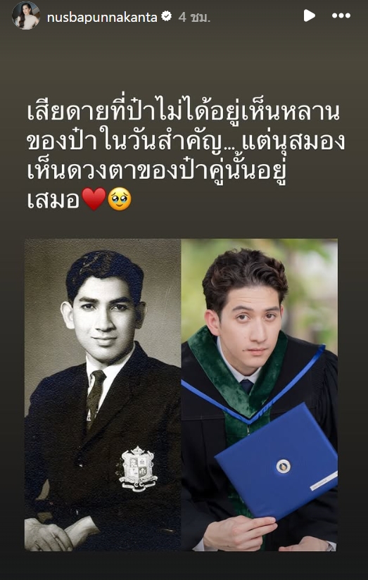 ซึ่ง "นุสบา" ได้โพสต์พร้อมข้อความสุดซึ้งว่า “เสียดายที่ป๋าไม่ได้อยู่เห็นหลานของป๋าในวันสำคัญ แต่นุสมองเห็นดวงตาของป๋าตู่นั้นอยู่เสมอ”