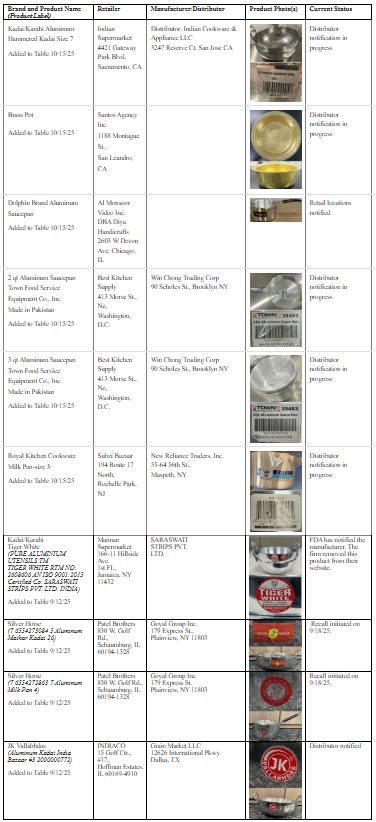 องค์การอาหารและยาแห่งสหรัฐอเมริกา (FDA) ออกประกาศเตือนในเดือนสิงหาคม 2025 ว่ามีชุดเครื่องครัวนำเข้า บางรุ่นที่เมื่อใช้งานกับอาหาร อาจปล่อยตะกั่วลงสู่อาหารได้ ซึ่งอาจเป็นอันตรายต่อสุขภาพ โดยเฉพาะเด็กและหญิงตั้งครรภ์