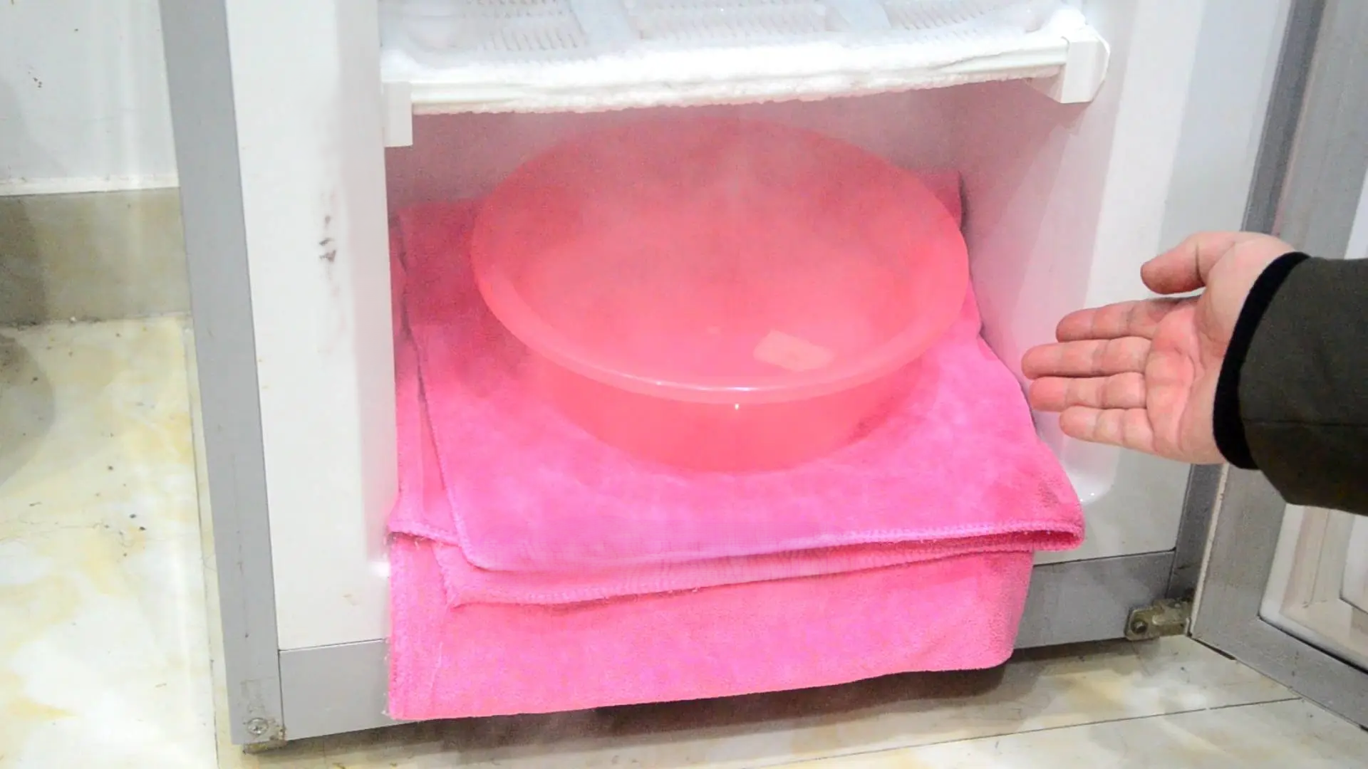 เตรียมอ่างและเทน้ำอุ่นลงไป (อุณหภูมิประมาณ 40-50°C อย่าให้ร้อนเกินไป เพื่อป้องกันความเสียหายกับพื้นผิวของตู้เย็น) จากนั้นปิดประตูตู้เย็นและรอประมาณ 10 นาที น้ำแข็งจะค่อยๆ ละลายและตกลงมาโดยอัตโนมัติ คุณยังสามารถเปิดโหมดเป่าผมด้วยความร้อนเพื่อให้น้ำแข็งละลายเร็วขึ้นได้ สุดท้ายใช้ผ้าขนหนูเช็ดน้ำในตู้เย็นออก