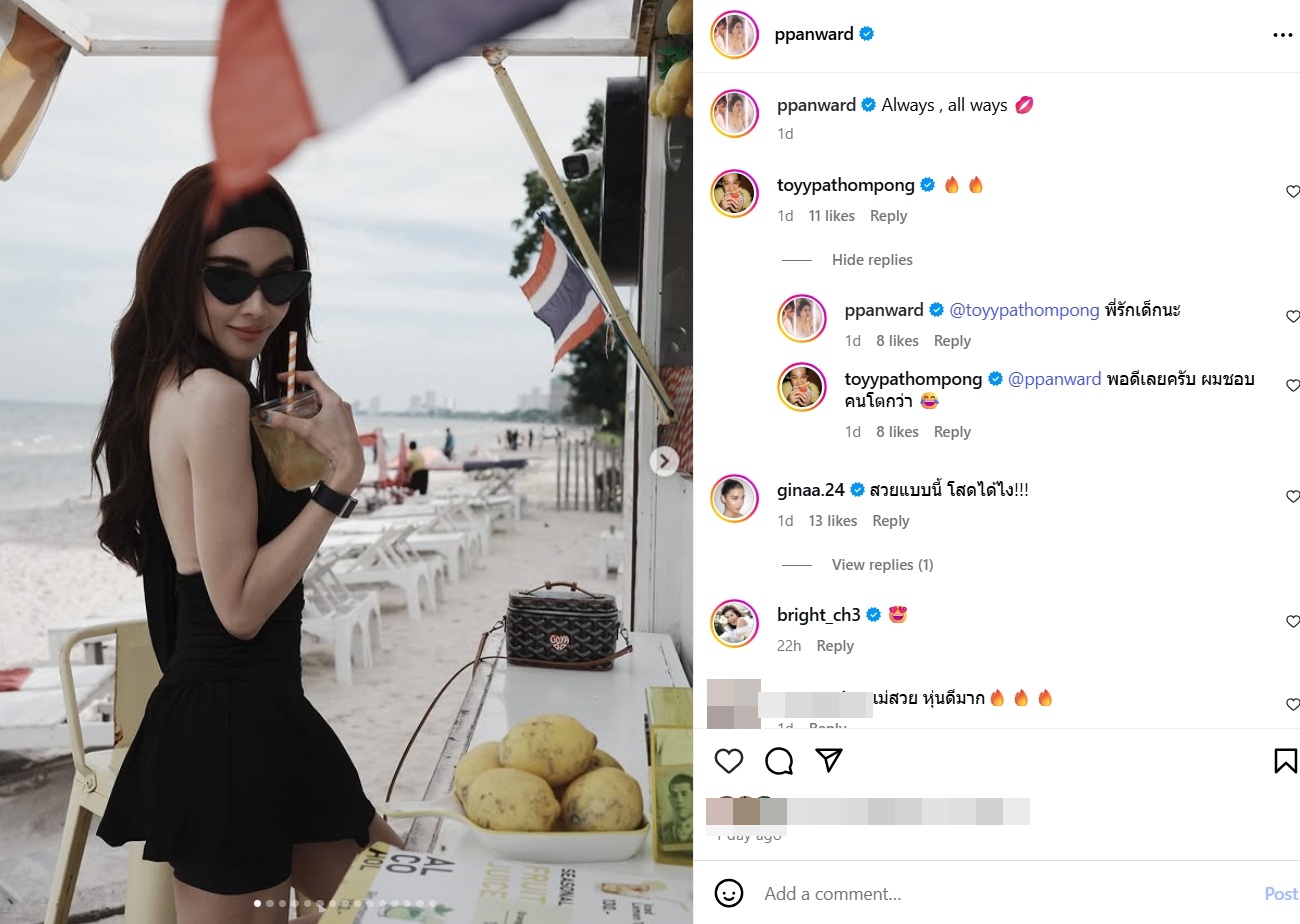 และสิ่งที่สะดุดตาไม่ใช่แค่ภาพของ เป้ย ปานวาด เท่านั้น เพราะในคอมเมนต์มีข้อความจากพระเอกหนุ่มรุ่นน้อง ทอย ปฐมพงศ์ เข้ามาทิ้งอีโมจิ "ไฟลุกพรึ่บ!" สื่อถึงความร้อนแรงแบบไม่มีพัก