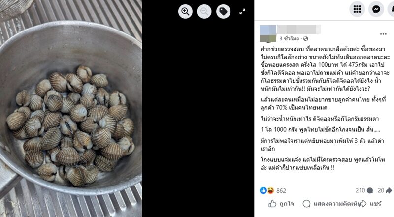 วันที่ 23 ต.ค.68 ได้มีผู้ใช้เฟซบุ๊กรายหนึ่ง โพสต์ลงในกลุ่ม “พวกเราคือผู้บริโภค” หลังไปซื้อหอยที่ตลาดนาเกลือ แต่พอเอาไปชั่งกิโลดิจิตอลกลับพบว่า น้ำหนักหอยหายไป 25 กรัม โดยระบุว่า