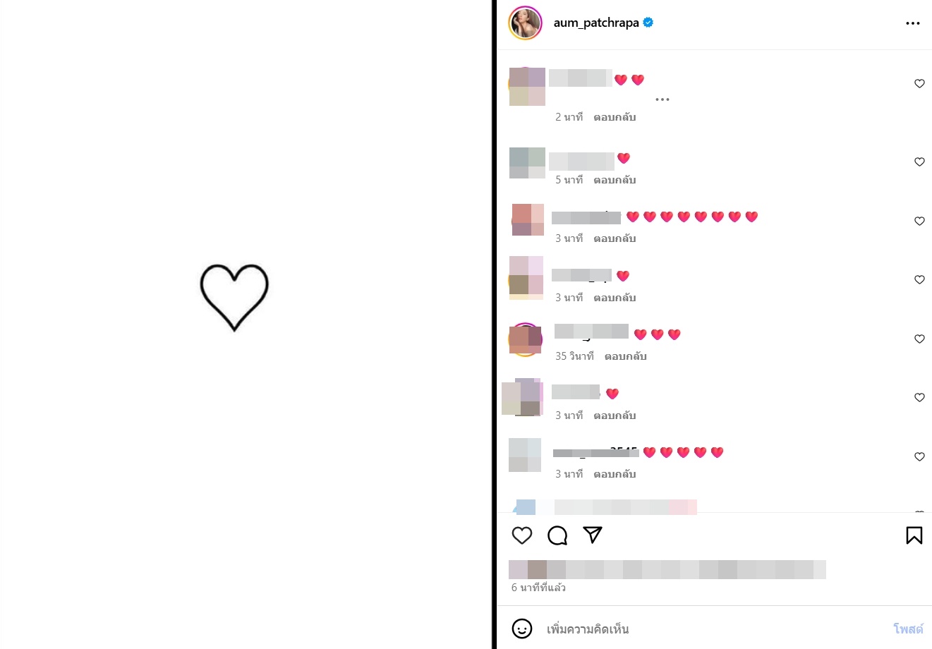 โดยล่าสุด อั้ม พัชราภา ได้ออกมาโพสต์ภาพ รูปหัวใจ ลงอินสตาแกรมส่วนตัว งานนี้ทำเอาชาวเน็ตกระหน่ำกดไลก์ และคอมเมนต์เหมือนกันหมดเป็นอีโมจิรูปหัวใจสีแดง เรียกว่ามาพร้อมเพรียงกันมาก