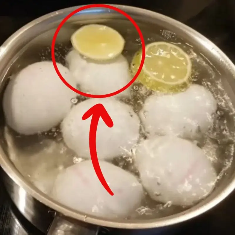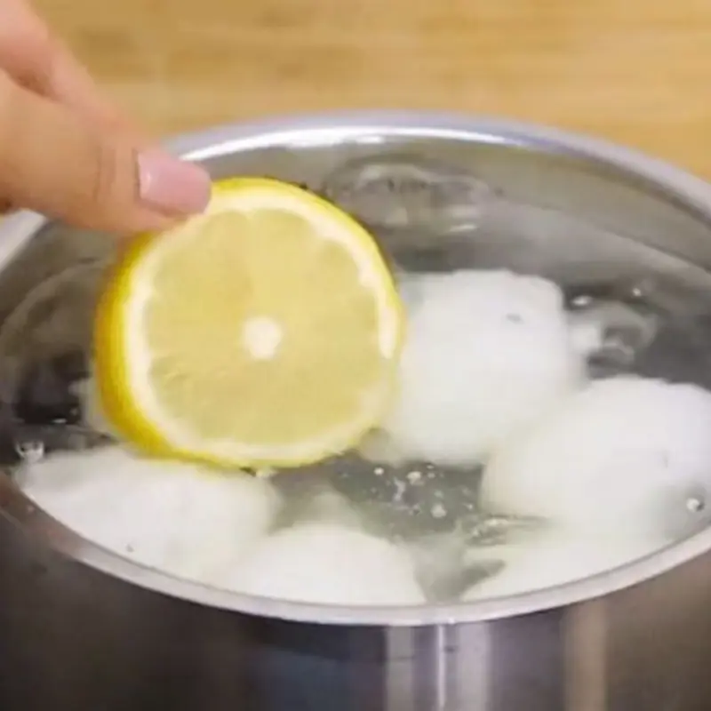 ระหว่างต้มไข่ ให้ใส่ มะนาวหั่นแว่น 2–3 แผ่น ลงไปในน้ำเดือด